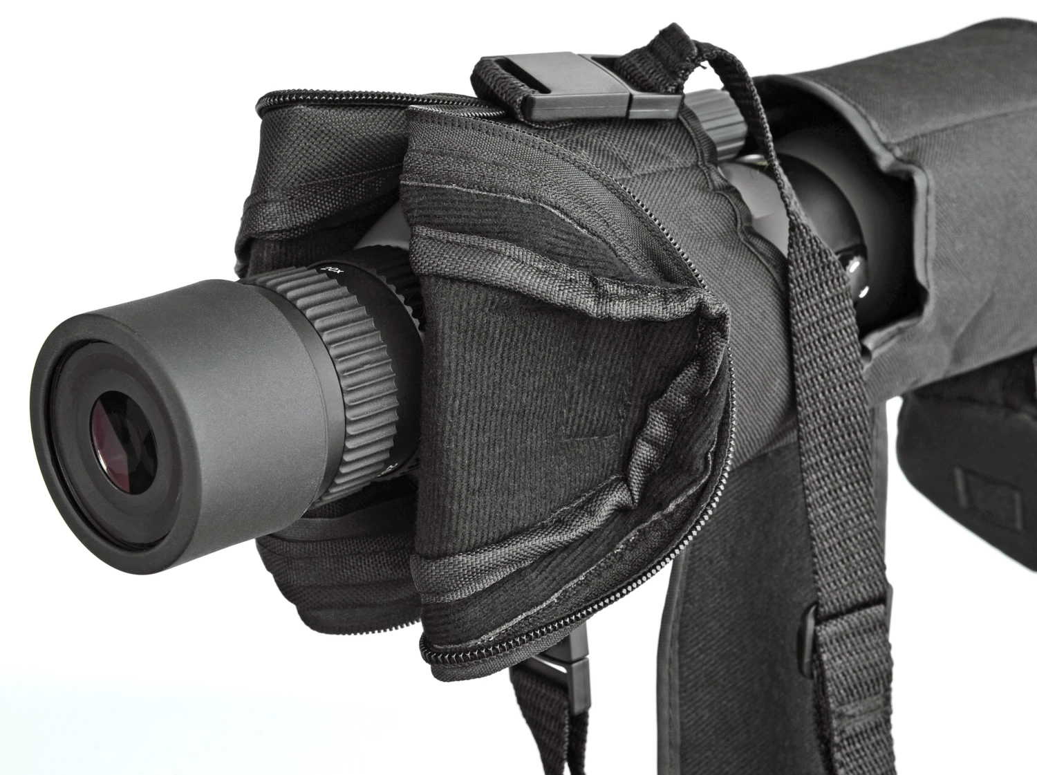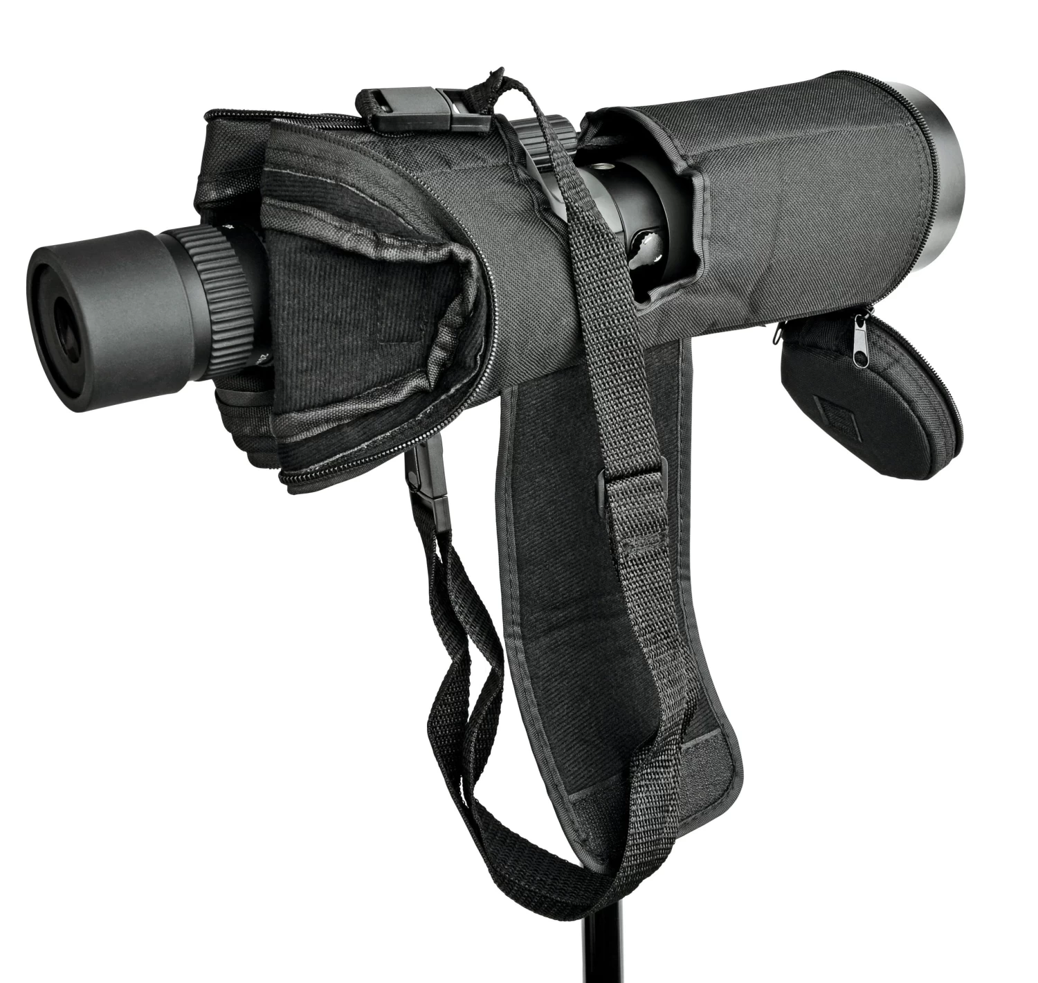 A universal bag made of durable nylon fabric with shoulder straps are included in the scope of delivery of the BRESSER Condor 20–60×85. On observations, the bag doesn’t have to be removed, because the most important sections (view, objective lens, focus adjustment, and tripod connection) can be opened separately. Through this, the spotting scope is optimally protected outdoors.