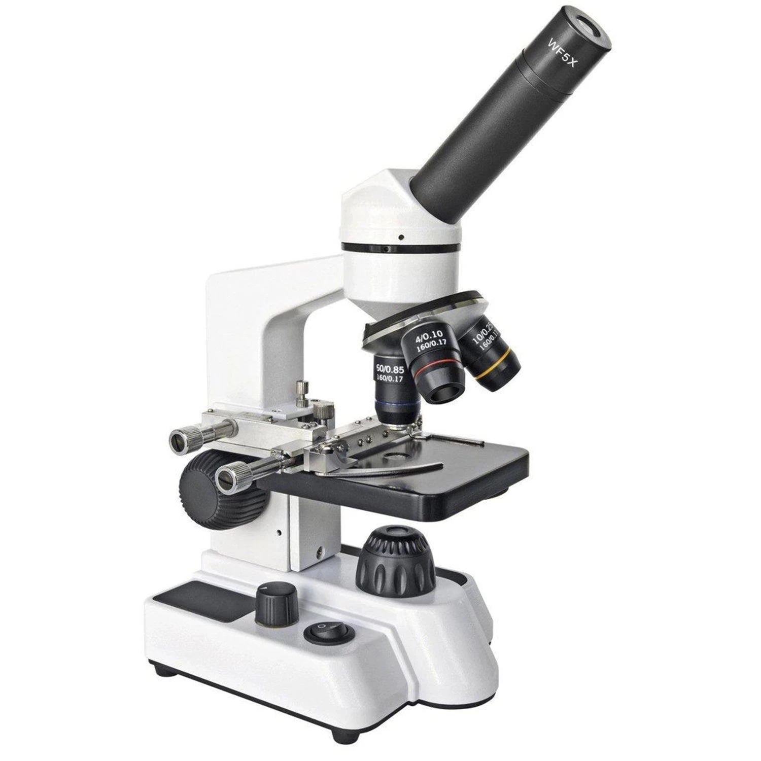 Optics: This transmitted light microscope is equipped with three widefield eyepieces (5x/10x/16x). The 360° rotatable monocular head allows for a comfortable viewing position at any time. The three objective lenses (4x/10x/60x) are held by a revolving nose piece. In addition, the BRESSER ERUDIT is equipped with a Barlow-Zoom-System. Thus, the magnification can be increased continuously (ZOOM) up to 1,536x. The battery-driven LED light provides a specially bright illumination of the preparation. The contrast of the illumination can be adjusted as needed by means of a filter wheel underneeth the specimen stage.