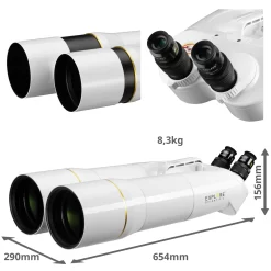 The BT series binoculars are designed for tough outdoor use. The IPX6 sealed and nitrogen-filled design effectively prevents fogging of the internal optics even under difficult weather conditions. The very light magnesium housing saves weight and makes it easy to handle. Two EXPLORE SCIENTIFIC 20mm eyepieces of the 62 degree LER series already included. EXPLORE SCIENTIFIC is an established manufacturer of extremely high-quality eyepieces in the astronomy scene. An optical system is only as good as its weakest component. Therefore we have decided to deliver these giant binoculars with a pair of quality eyepieces of the 62 degree LER series. With an apparent field of view of 62 degrees and a focal length of 20mm, the BT-120 binoculars produce a 33x magnification. Thus these wide angle eyepieces offer a very good overview (field of view 1.8 degree) at moderate magnification. The large interpupillary distance of these LER (long eye relief) eyepieces of 15mm and soft silicone eyecups, which can be turned inside out, also guarantee a comfortable and relaxed view. For astronomy, a flat and sharp image field is advantageous and offers a particularly impressive viewing experience even during the day. Due to the waterproof design and the argon filling, these eyepieces are absolutely durable and easy to clean.ย