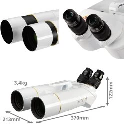 The BT series binoculars are designed for tough outdoor use. The IPX6 sealed and nitrogen-filled design effectively prevents fogging of the internal optics even under difficult weather conditions. The very light magnesium housing saves weight and makes it easy to handle. Two EXPLORE SCIENTIFIC 20mm eyepieces of the 62 degree LER series already included. EXPLORE SCIENTIFIC is an established manufacturer of extremely high-quality eyepieces in the astronomy scene. An optical system is only as good as its weakest component. Therefore we have decided to deliver these giant binoculars with a pair of quality eyepieces of the 62 degree LER series. With an apparent field of view of 62 degrees and a focal length of 20mm, the BT-70 binoculars produce a 20x magnification. Thus these wide angle eyepieces offer a very good overview (field of view 3.1 degree) at moderate magnification. The large interpupillary distance of these LER (long eye relief) eyepieces of 15mm and soft silicone eyecups, which can be turned inside out, also guarantee a comfortable and relaxed view. For astronomy, a flat and sharp image field is advantageous and offers a particularly impressive viewing experience even during the day. Due to the waterproof design and the argon filling, these eyepieces are absolutely durable and easy to clean.