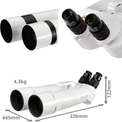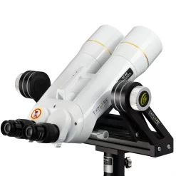 The BT series binoculars are designed for tough outdoor use. The IPX6 sealed and nitrogen-filled design effectively prevents fogging of the internal optics even under difficult weather conditions. The very light magnesium housing saves weight and makes it easy to handle. Two EXPLORE SCIENTIFIC 20mm eyepieces of the 62 degree LER series already included. EXPLORE SCIENTIFIC is an established manufacturer of extremely high-quality eyepieces in the astronomy scene. An optical system is only as good as its weakest component. Therefore we have decided to deliver these giant binoculars with a pair of quality eyepieces of the 62 degree LER series. With an apparent field of view of 62 degrees and a focal length of 20mm, the BT-82 binoculars produce a 24x magnification. Thus these wide-angle eyepieces offer a very good overview (field of view 2.6 degree) at moderate magnification. The large interpupillary distance of these LER (long eye relief) eyepieces of 15mm and soft silicone eyecups, which can be turned inside out, also guarantee a comfortable and relaxed view. For astronomy, a flat and sharp image field is advantageous and offers a particularly impressive viewing experience even during the day. Due to the waterproof design and the argon filling, these eyepieces are absolutely durable and easy to clean.ย