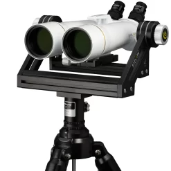 When using these large binoculars, a sturdy photo tripod with an appropriate load capacity is highly recommended. The connection is made via two 1/4 inch or one 3/8 inch threaded holes (standard photo tripod thread) in the tripod adapter of the binoculars. The ideal solution is to use the optional available EXPLORE SCIENTIFIC U-Mount with field tripod (item No. 01-14300). This is specially designed for the large binoculars of the BT series and carries these devices absolutely safely. The excellent mechanism with adjustable friction in both axis allows easy moving and tracking. The binocular position is kept stable depending on the adjusted friction intensity. Vibrations are reduced to a minimum by the massive construction of the U-Mount and the large stainless steel tripod. Even at high magnification there are no vibrations and the finest details can be observed.