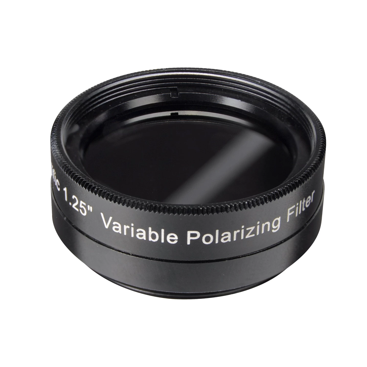 Universally applicable variable polarizing filter with 1.25″ filter thread. This variable polarizing filter allows continuous adjustment of image brightness. This is very helpful to strong contrast differences compensate individually to various observation objects. Especially with the Lunar and planetary observation but also in solar observing this prevents filter a blooming of the finest details.