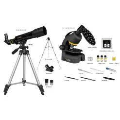- Telescope comes with a tabletop tripod, an eyepiece diagonal for comfortable viewing and two interchangeable eyepieces.
